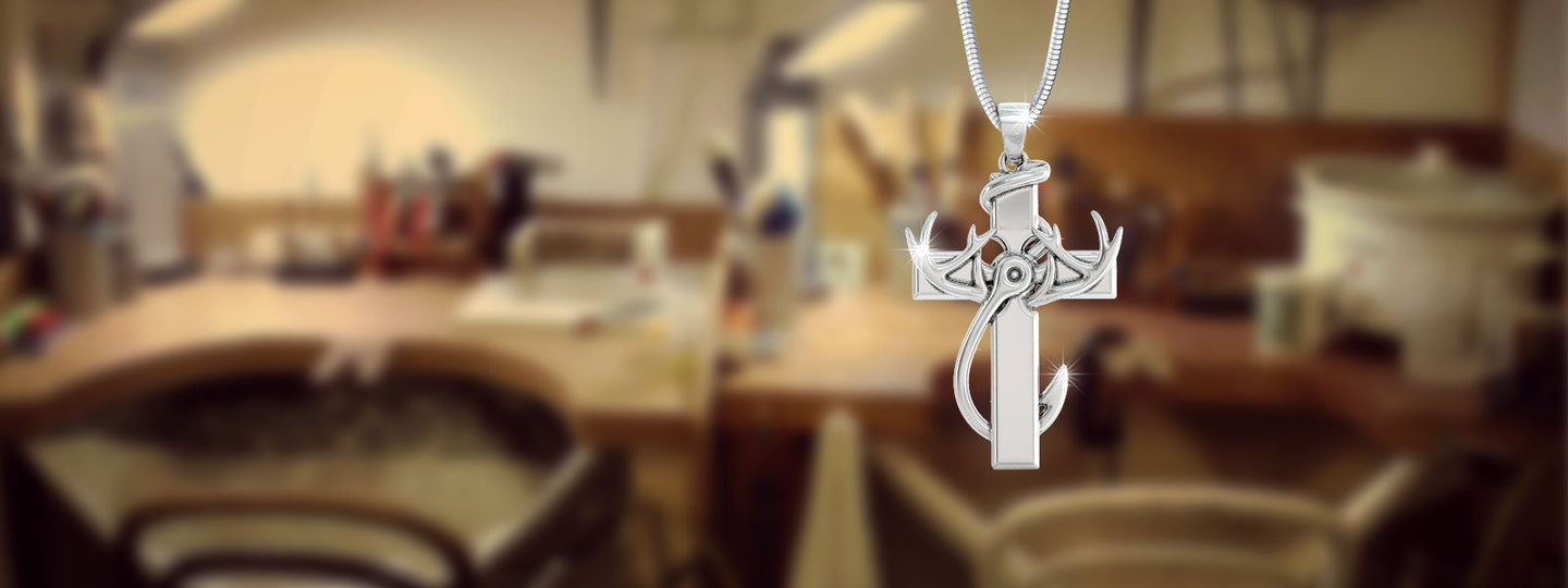 In stock now! Get yours before they are gone. Our original Hunting, Faith & Fishing cross pendant makes a great gift or add to your fine jewelry collection.